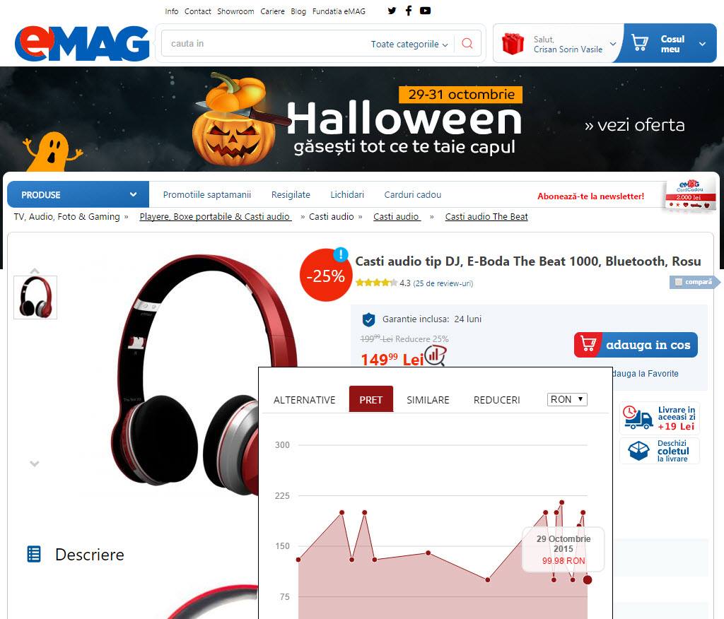 Am vazut pe Facebook o poza despre marile reduceri de la eMag. Sorin Crisan a gasit o pereche de casti care erau mai ieftine inainte de super oferta de Halloween.