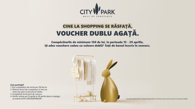 De Paște, City Park Mall le oferă clienților care fac cumpărături de minimum 150 lei șansa de a câștiga vouchere perfecte pentru propriul răsfăț sau pentru a fi făcute cadou. În perioada 15 – 29 aprilie, participanții se pot înscrie exclusiv online, pe www.city-park.ro/voucherul-dublu, la tragerea la sorți din cadrul campaniei „Cine la shopping se răsfață, voucher dublu agață”. Aceștia pot câștiga un voucher de cumpărături cu valoare dublă față de bonul înscris în concurs.