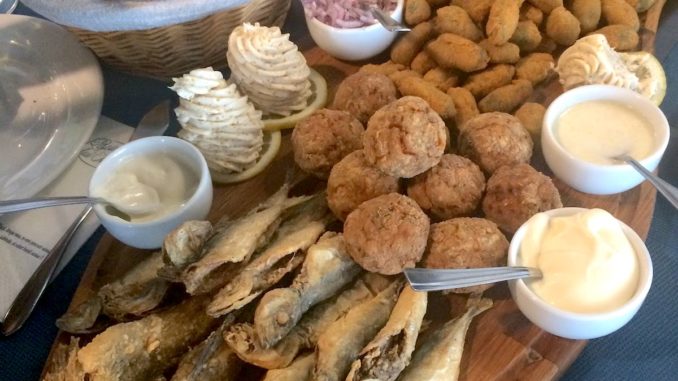 – Platou în formă de pește pe care pun: midii pane, hamsie prăjită (proaspătă, nu ca aia din Mamaia), chifteluțe de pește, icre de știucă cu puțină ceapă și pâine prăjită. Eu NU mănânc pește și fructe de mare decât de 1-2 ori pe an. Și cred că doar pe aici am mâncat în ultimii 5 ani. Da, e platoul din imaginea principală a acestui articol.