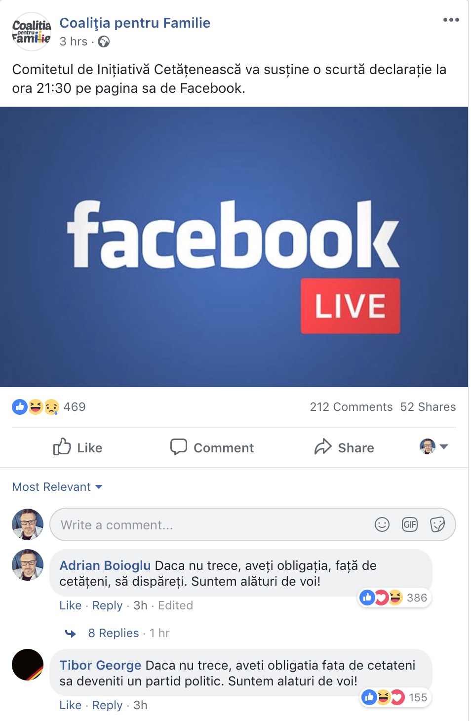 Bonus: Un mesaj postat pe pagina Coaliției pentru Familie. Era doar o parafrazare a unui comentariu lăsat de un admirator de-al lor :)