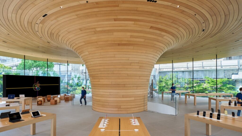 Apple Central World’s distinctive architecture is brought to life with the first-ever all-glass design, housed under a cantilevered Tree Canopy roof. Once inside, customers can travel between two levels via a spiral staircase that wraps around a timber core, or riding a unique cylindrical elevator clad in mirror-polished stainless steel. Guests can enter from the ground or upper level, which provides a direct connection to the Skytrain and the city’s largest shopping center. The outdoor plaza offers a place for the community to gather, with benches and large Terminalia trees surrounding the space.
