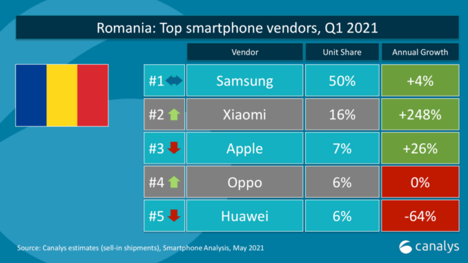 Potrivit raportului Canalys, Xiaomi s-a clasat pe locul al doilea în România la livrările de telefoane inteligente pentru prima dată din istorie. În primul trimestru din 2021, Xiaomi a avut o cotă de piață pe segmentul smartphone de 16% și o creștere anuală de 248%.