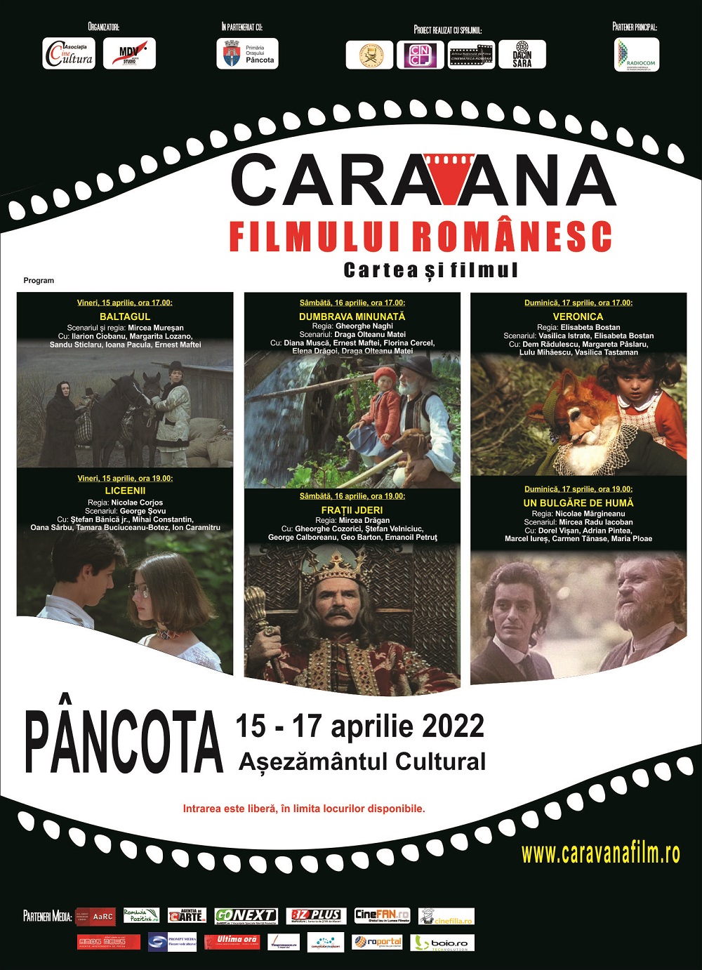 „Caravana filmului românesc – Cartea şi filmul” pornește din nou la drum, iar prima localitate programată în traseul de anul acesta este orașul Pâncota, județul Arad. Aici, copii, părinții și bunicii sunt invitați la Așezământul Cultural, în perioada 15 – 17 aprilie, de la orele 17.00 și 19.00, să vizioneze unele dintre cele mai frumoase filme românești.