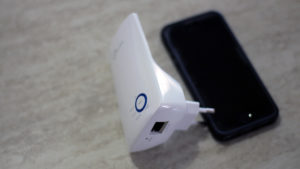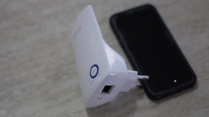 TP-Link TL-WA850RE este de mărimea unui iPhone 8, dar ceva mai gros. Are o mufă de priză încorporată și dacă ai deja cablurile de net trase prin pereți, poți să-i sporești viteza dacă îl conectezi direct. Și, la fel ca și iPhone are un fel de Home Button (un buton rotund) cu care