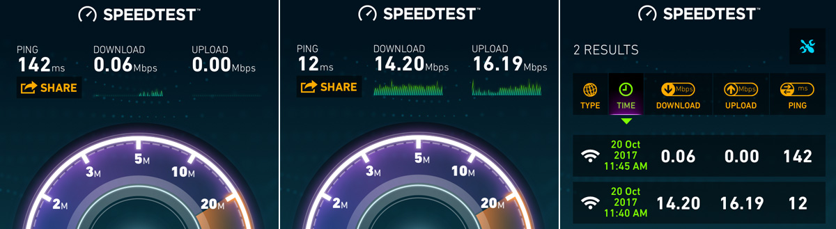 1. Fără Range Extender aveam un PING de 142 ms, Upload zero și download la limita inferioară.