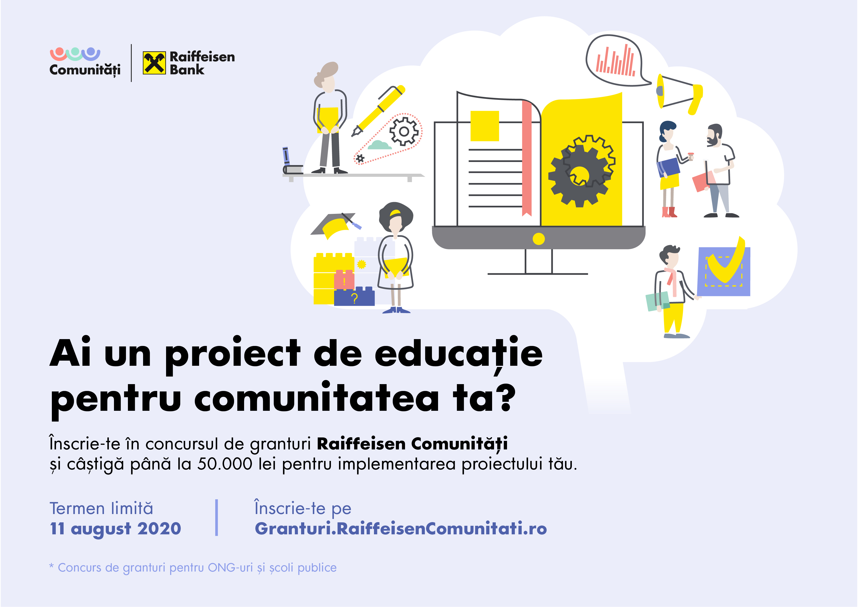 Dezvoltat de Raiffeisen Bank România, concursul de granturi oferă finanțare a câte 50.000 de lei pentru 10 proiecte educaționale care pot schimba viitorul comunităților din România. Termenul limită pentru depunerea ideilor pentru educație din acest an este 11 august, 2020, ora 17.00, pe platforma https://granturi.raiffeisencomunitati.ro/.