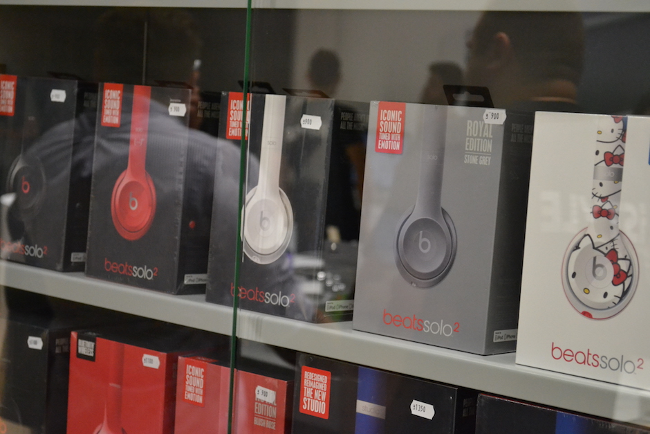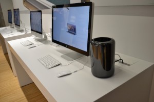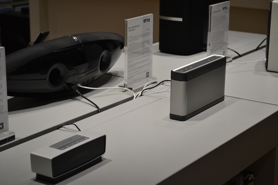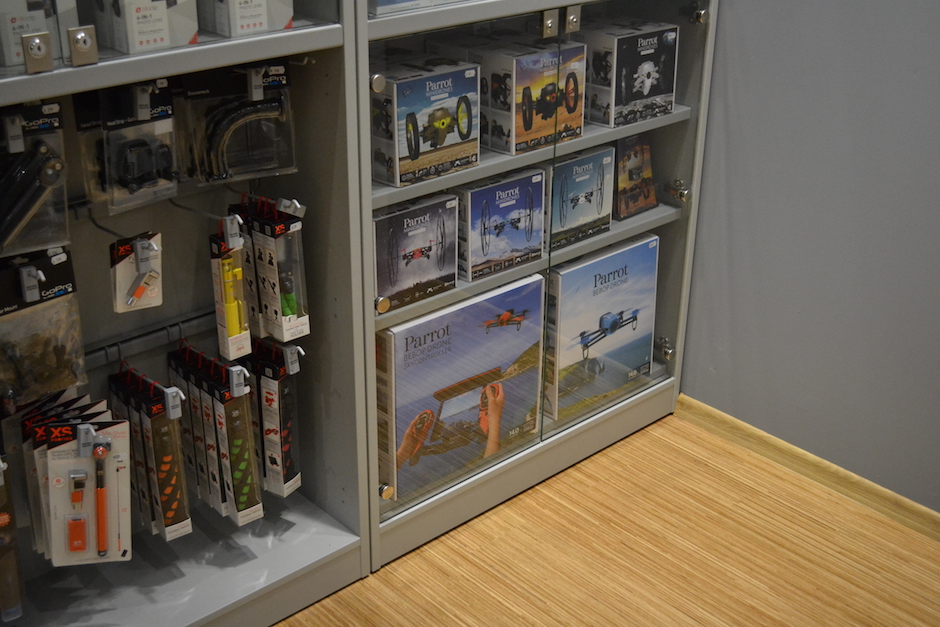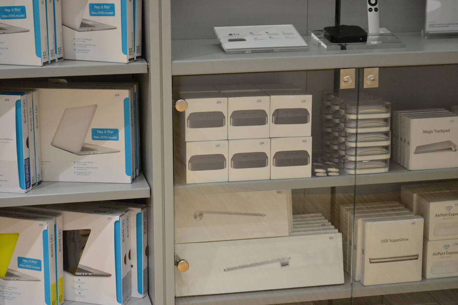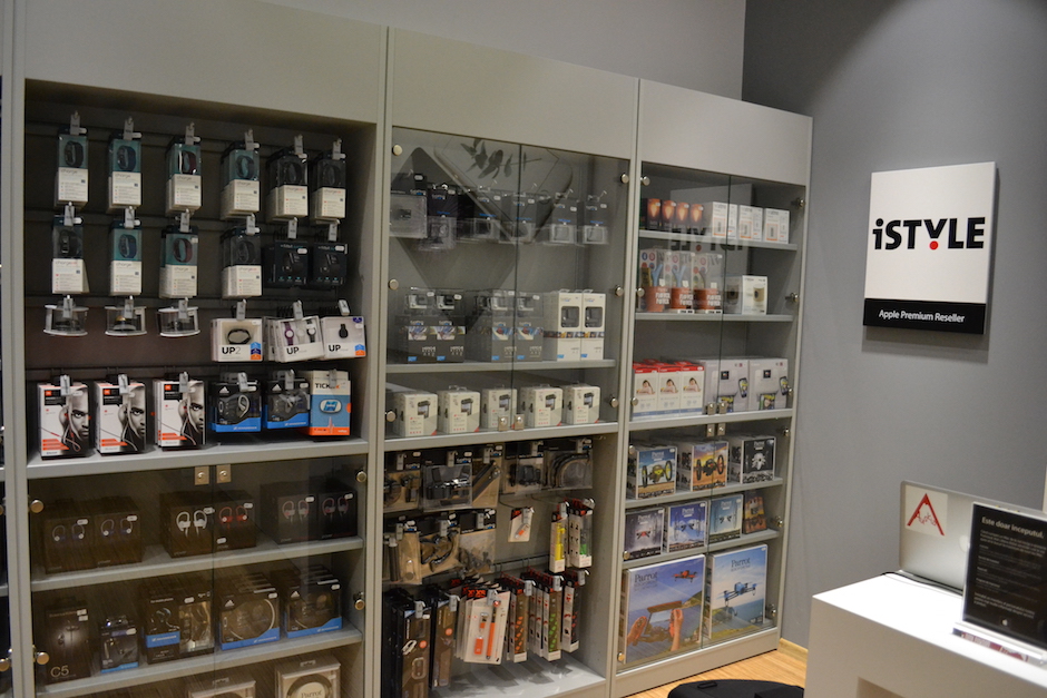Pe drumul catre peretele opus intrarii dai de doua mese patrate care au boxe si alte accesorii. Peretii sunt si ei captusiti cu mese pentru linia MacBook Pro sau Air, Mac Pro si iMac, iar spre spatele magazinului sunt rafturile cu accesorii si alte produse (GoPro, drone, fitness bands sau Apple TV).