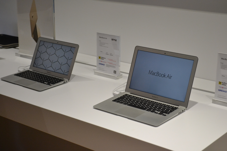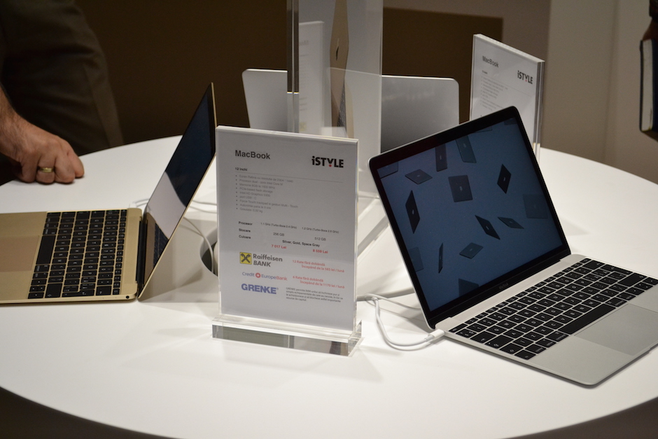 La intrare gasesti masute rotunde care au la display noul MacBook. Nu l-am mai vazut pana acum in Romania si m-am dus direct la trackpad-ul lui sa-l testez. Acele insule rotunde sunt in tot magazinul. Unele gazduiesc iPad-uri, altele au iPhone, iPod touch sau casti si accesorii Beats.