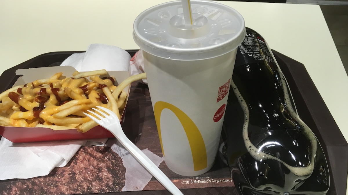 Vin într-o cutie de carton subțire și nu sunt altceva decât niște cartofi prăjiți normali de Mac peste care angajatul pune 2 sosuri din niște sticluțe de plastic. Costă cam 7 lei, sau, dacă iei și un meniu, plătești 2,70 lei în plus.