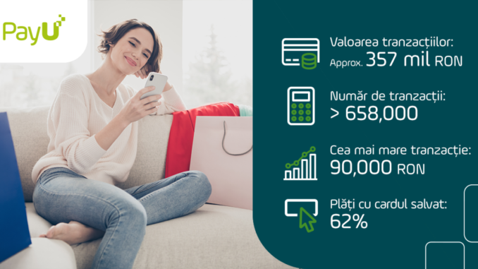 Valoarea totală a tranzacțiilor online realizate prin platforma PayU a ajuns la 357 milioane de lei, în timp ce numărul acestora a atins pragul de 658.000 de tranzacții, în creștere cu 22% față de anul trecut.