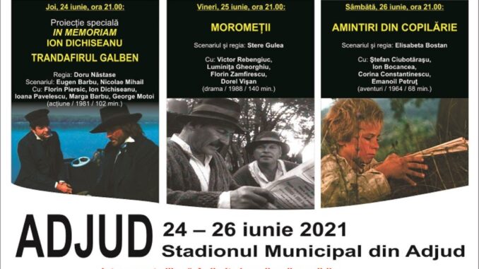 Programul demarează joi, 24 iunie, cu o proiecție specială dedicată maestrului Ion Dichiseanu, născut la Adjud, pe 20 octombrie 1933, Cetățean de Onoare al municipiului de pe Trotuș. În memoria îndrăgitului actor, începând cu ora 21.00, va fi proiectat filmul „Trandafirul galben”, în regia lui Doru Năstase, în care Ion Dichiseanu joacă alături de Florin Piersic, Marga Barbu, Ioana Pavelescu și George Motoi.
